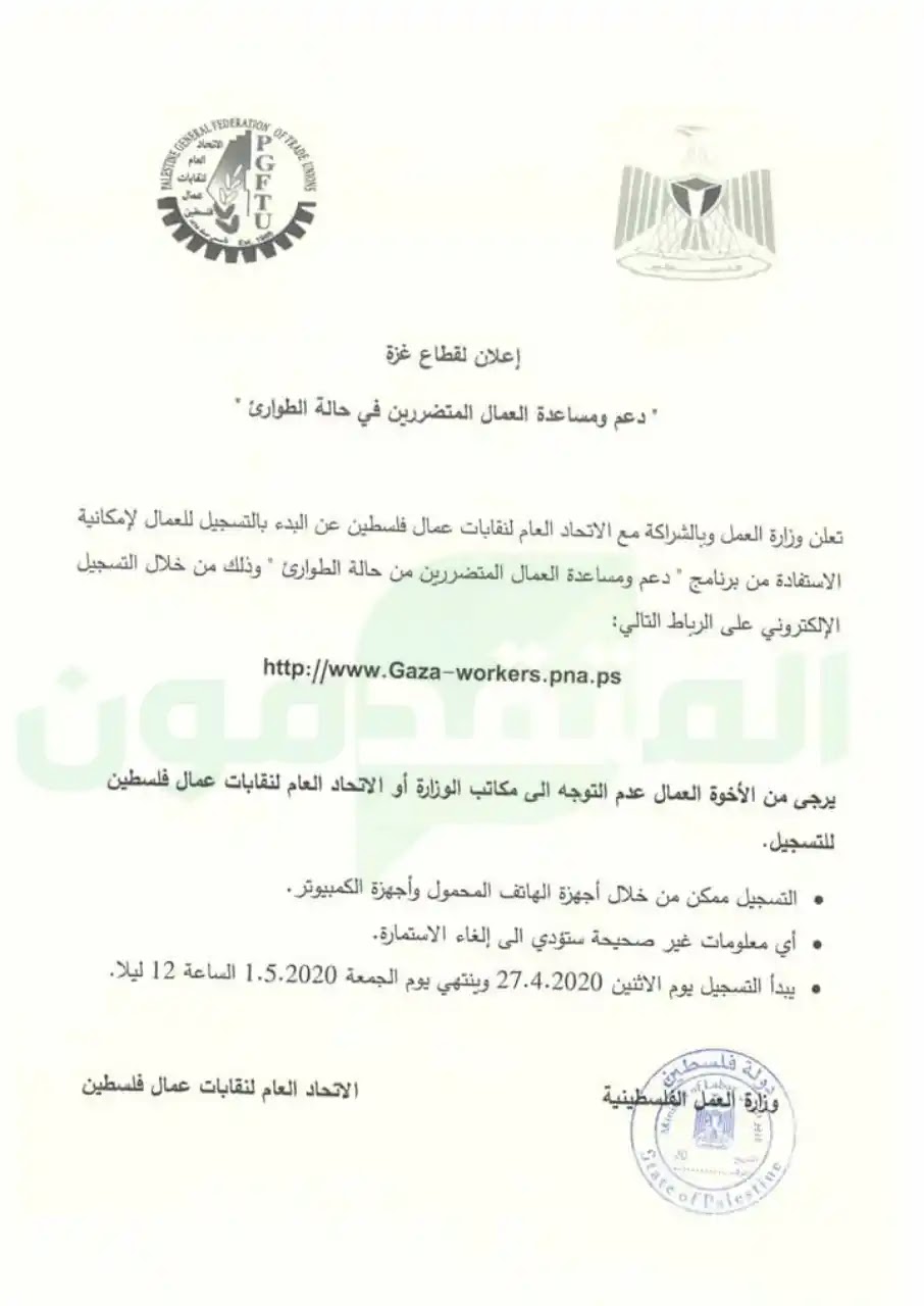 مهم للعمال بقطاع غزة وزارة العمل رام الله تفتح باب التسجيل للاستفادة من برنامج دعم ومساعدة العمال المتضررين من حالة الطوارئ موقع المتقدمون